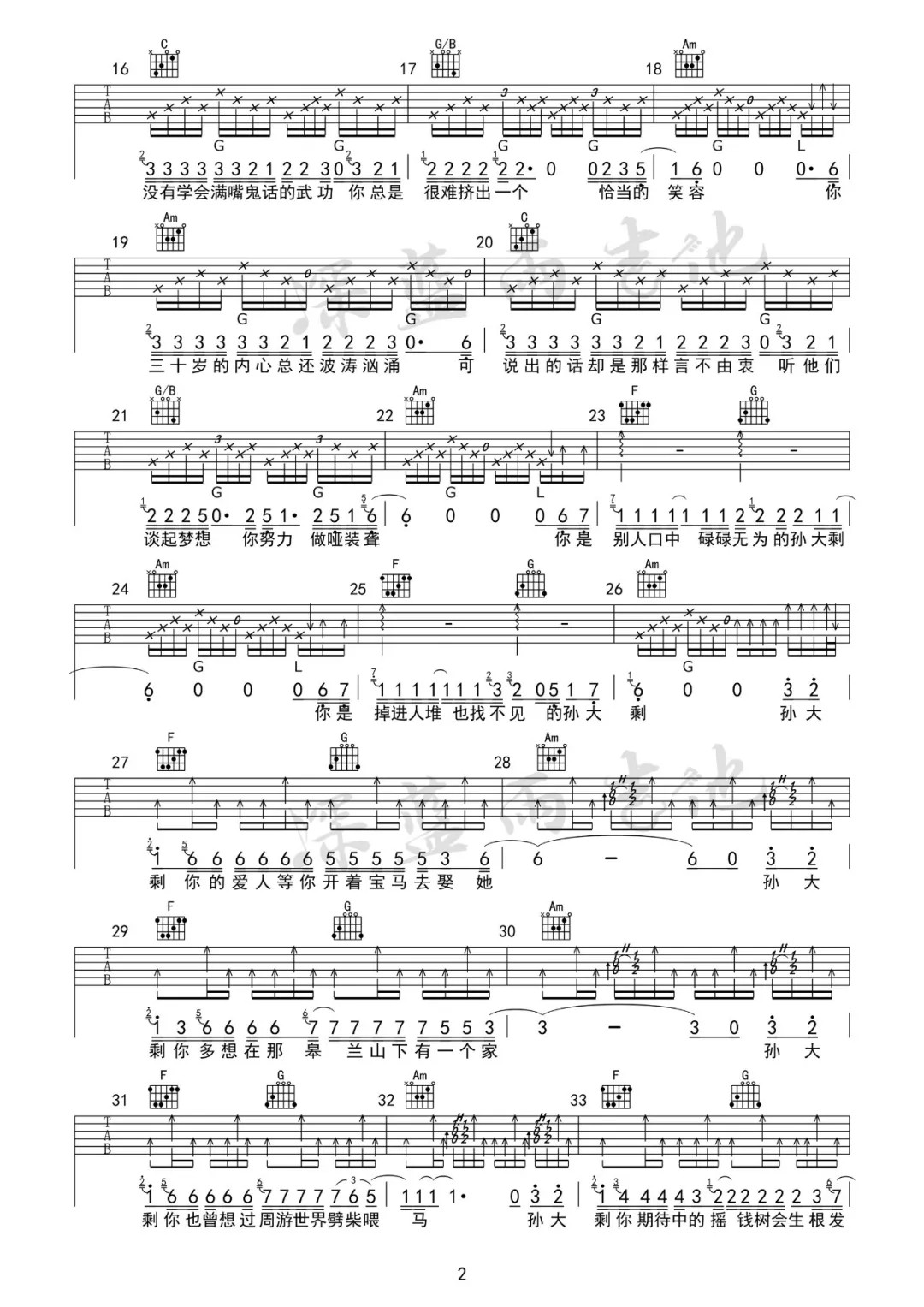 孙大剩吉他谱 视频教学深蓝雨吉他 歌词