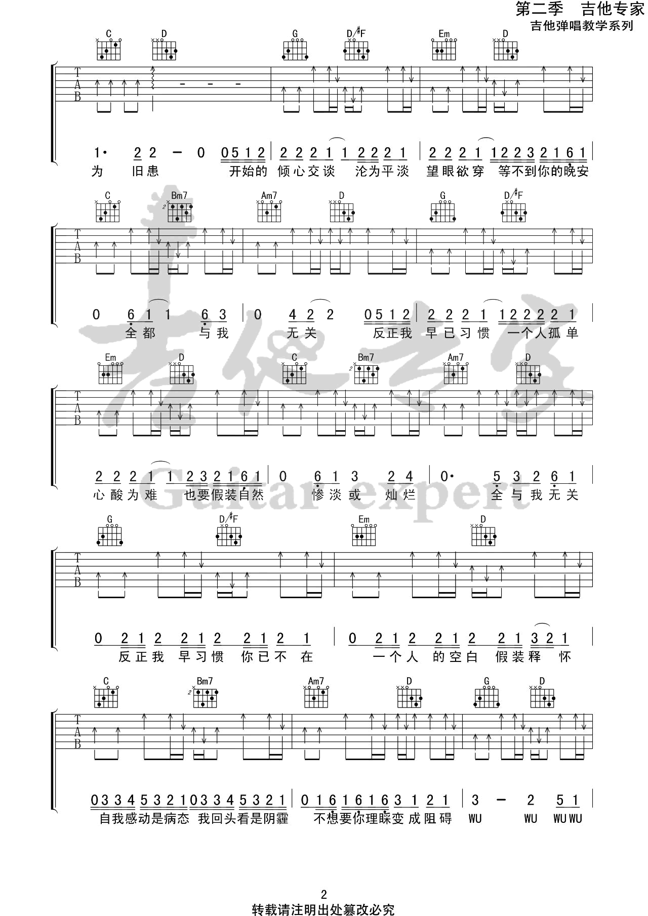 • 与我无关吉他谱 G调弹唱谱六线谱高清版
